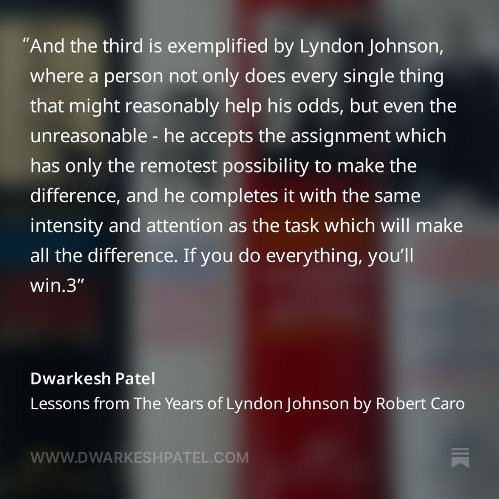 This from Dwarkesh Patel’s podcast/blog post: Lessons from The Years of Lyndon Johnson by Robert Caro